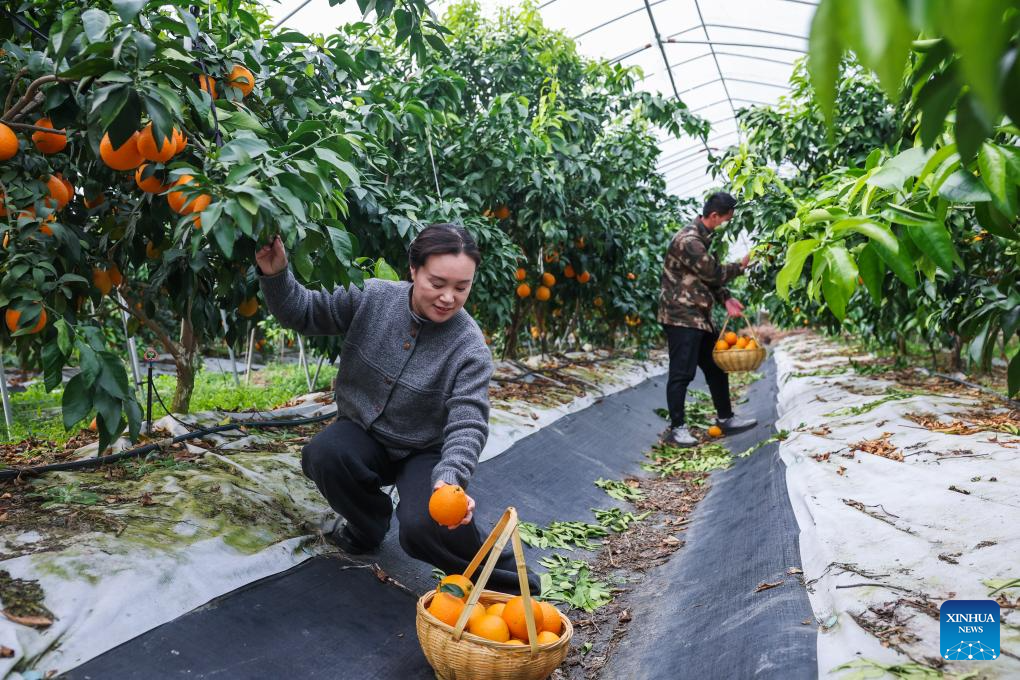 Tourists pick citruses at an orchard in Dongshan Village of Heping Town in Changxing County of Huzhou City, east China's Zhejiang Province, Dec. 4, 2025. In recent years, Heping Town has been promoting the modernization, standardization, professionalization and digitalization of its agricultural industry to effectively improve the quality of local agricultural products. What's more, relying on its modern agricultural resources, Heping Town also strives to develop its rural tourism industry through various activities like fruits leisure picking and vegetable and fruits study and research tours. (Xinhua/Xu Yu)