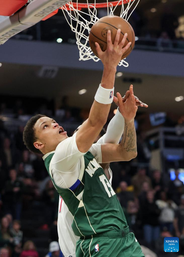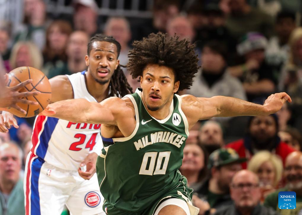 Kevin Porter Jr. (L) of Milwaukee Bucks goes for a layup during the 2025-2026 NBA regular season game between Milwaukee Bucks and Detroit Pistons in Milwaukee, the United States, on Dec. 3, 2025. (Photo by Joel Lerner/Xinhua)