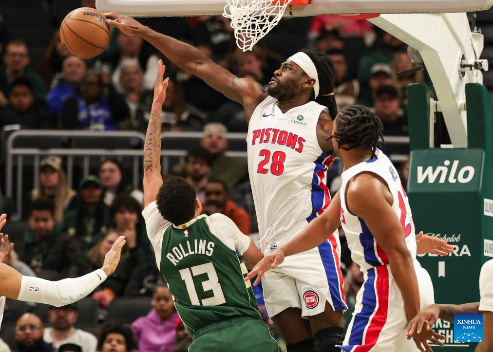 Isaiah Stewart (top) of Detroit Pistons blocks a shot by Ryan Rollins (L) of Milwaukee Bucks during the 2025-2026 NBA regular season game between Milwaukee Bucks and Detroit Pistons in Milwaukee, the United States, on Dec. 3, 2025. (Photo by Joel Lerner/Xinhua)