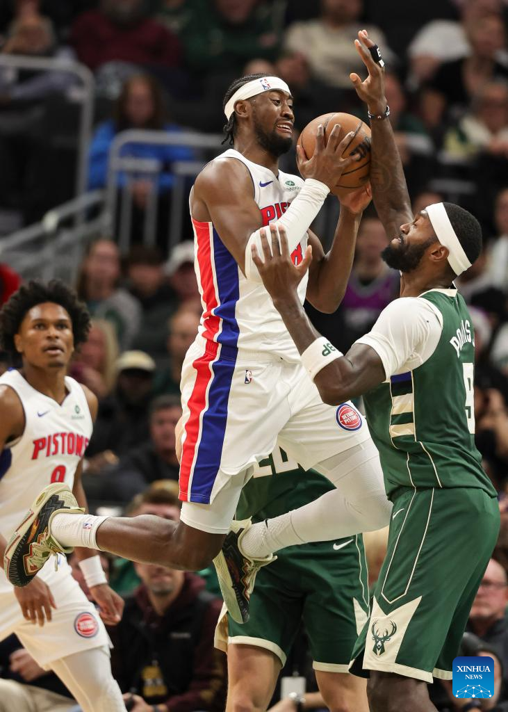 Caris Levert (top) of Detroit Pistons breaks through during the 2025-2026 NBA regular season game between Milwaukee Bucks and Detroit Pistons in Milwaukee, the United States, on Dec. 3, 2025. (Photo by Joel Lerner/Xinhua)