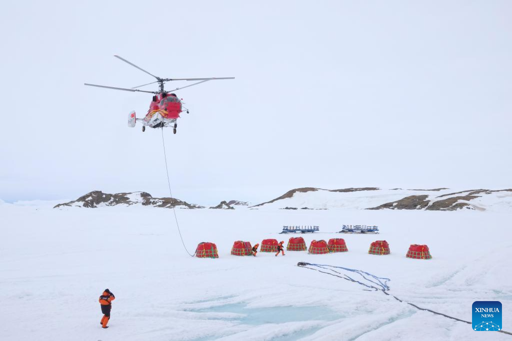 A helicopter transfers fuel bladders during China's 42nd Antarctic expedition operations near Zhongshan Station, a Chinese research base in Antarctica, on Dec. 2, 2025. (Xinhua/Gu Tiancheng)