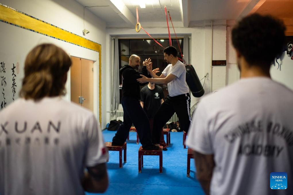 Ismet Himmet (rear L) instructs students in practicing Tuishou at XUAN-Gong Fu Academy in Berlin, Germany, Nov. 13, 2025. Ismet Himmet, with his Chinese name You Lihan, speaks fluent Chinese and has devoted more than thirty years to Chinese martial arts. He started teaching Chinese martial arts full-time in Germany from 2006 . (Xinhua/Zhang Haofu)