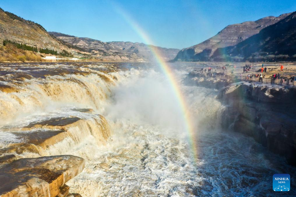 A drone photo taken on Dec. 3, 2025 shows a double rainbow over the Hukou Waterfall in Jixian County, north China's Shanxi Province. (Photo by Lyu Guiming/Xinhua)