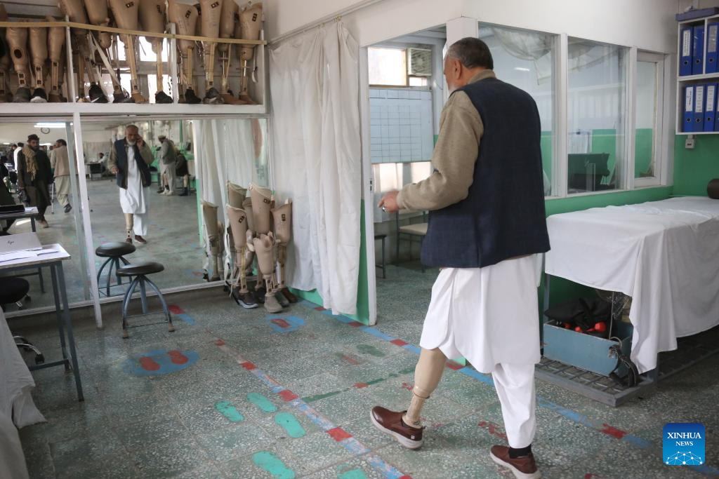 A handicapped man walks with a prosthetic leg at a rehabilitation center run by the International Committee of the Red Cross (ICRC) hospital in Kabul, Afghanistan, Nov. 30, 2025. (Photo by Saifurahman Safi/Xinhua)