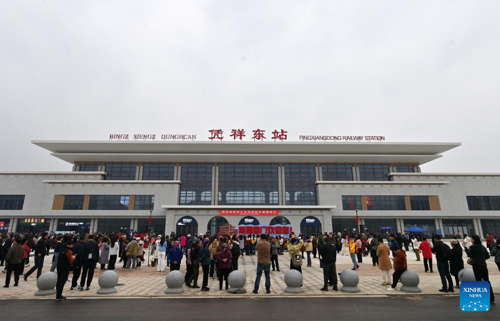 People perform a dance in celebration of the full operation of the Nanning-Pingxiang Railway at Pingxiang East Railway Station, in Pingxiang City, south China's Guangxi Zhuang Autonomous Region, on Dec. 5, 2025. The Chongzuo-Pingxiang section of the Nanning-Pingxiang Railway began operation on Friday, marking the full operation of the high-speed railway, which connects the region's capital city Nanning to the border city Pingxiang. (Xinhua/Lu Boan)