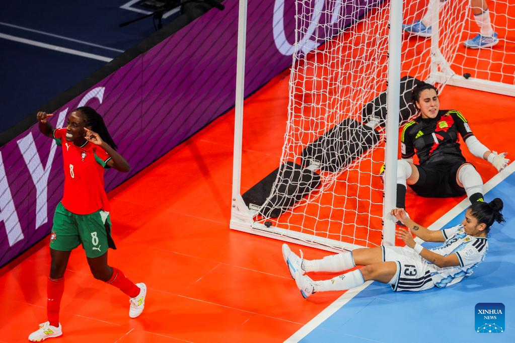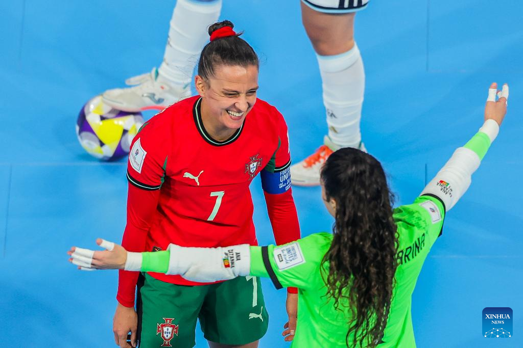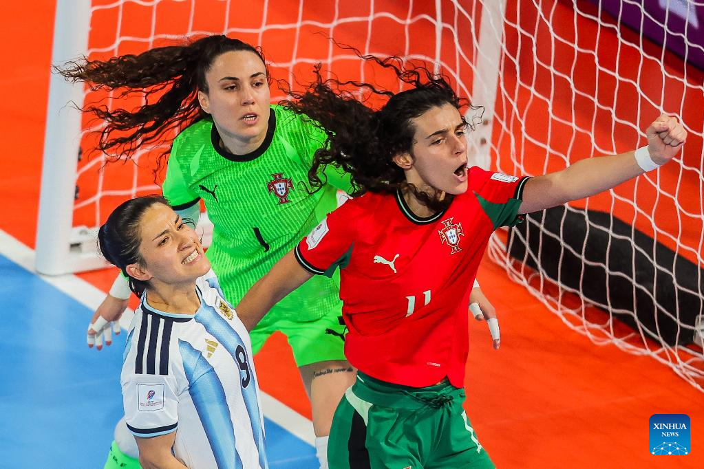 Janice Silva (L) of Portugal celebrates after scoring a goal during the semifinal match between Portugal and Argentina at the FIFA Futsal Women's World Cup 2025 in Pasig City, the Philippines, Dec. 5, 2025. (Xinhua/Rouelle Umali)