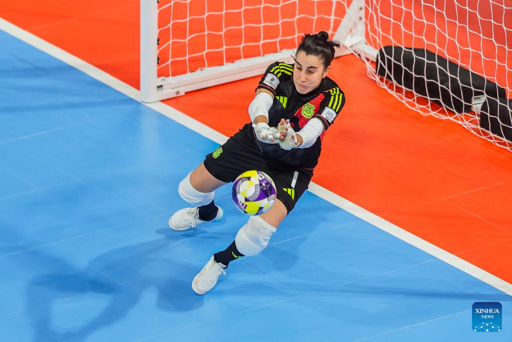 Goalkeeper Trinidad D Andrea of Argentina competes during the semifinal match between Portugal and Argentina at the FIFA Futsal Women's World Cup 2025 in Pasig City, the Philippines, Dec. 5, 2025. (Xinhua/Rouelle Umali)