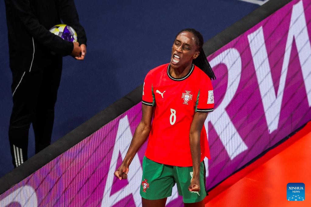 Janice Silva of Portugal celebrates after scoring a goal during the semifinal match between Portugal and Argentina at the FIFA Futsal Women's World Cup 2025 in Pasig City, the Philippines, Dec. 5, 2025. (Xinhua/Rouelle Umali)