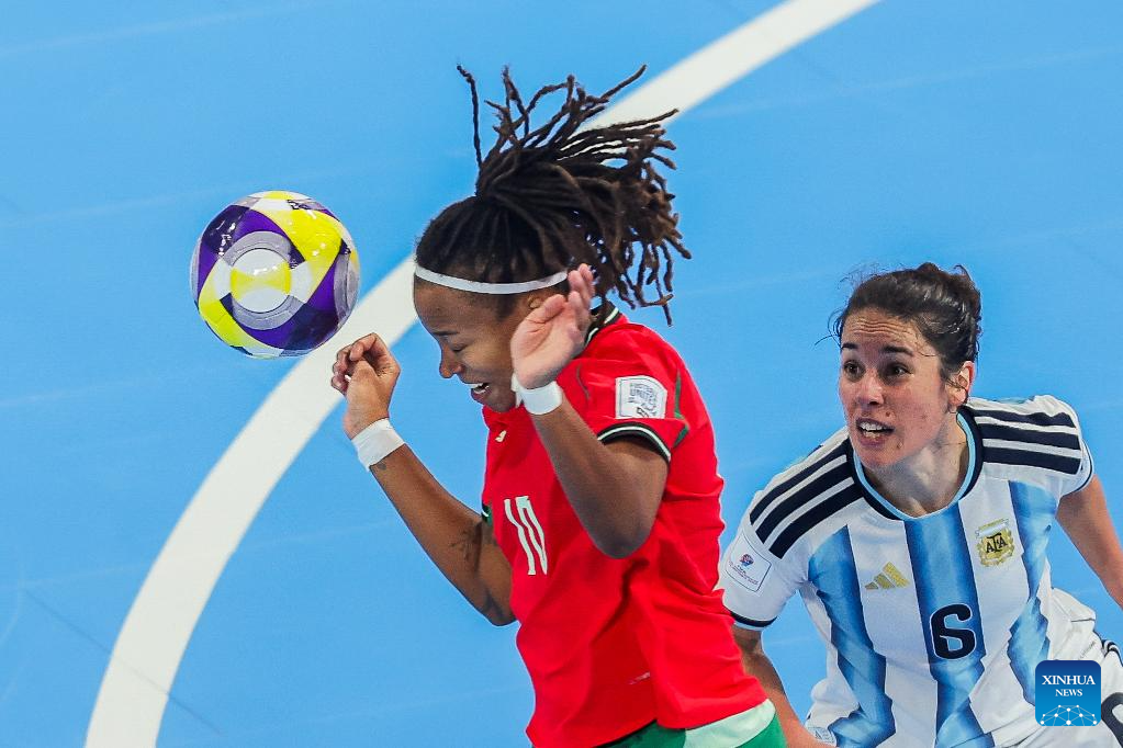 Maria Pereira (L) of Portugal competes during the semifinal match between Portugal and Argentina at the FIFA Futsal Women's World Cup 2025 in Pasig City, the Philippines, Dec. 5, 2025. (Xinhua/Rouelle Umali)