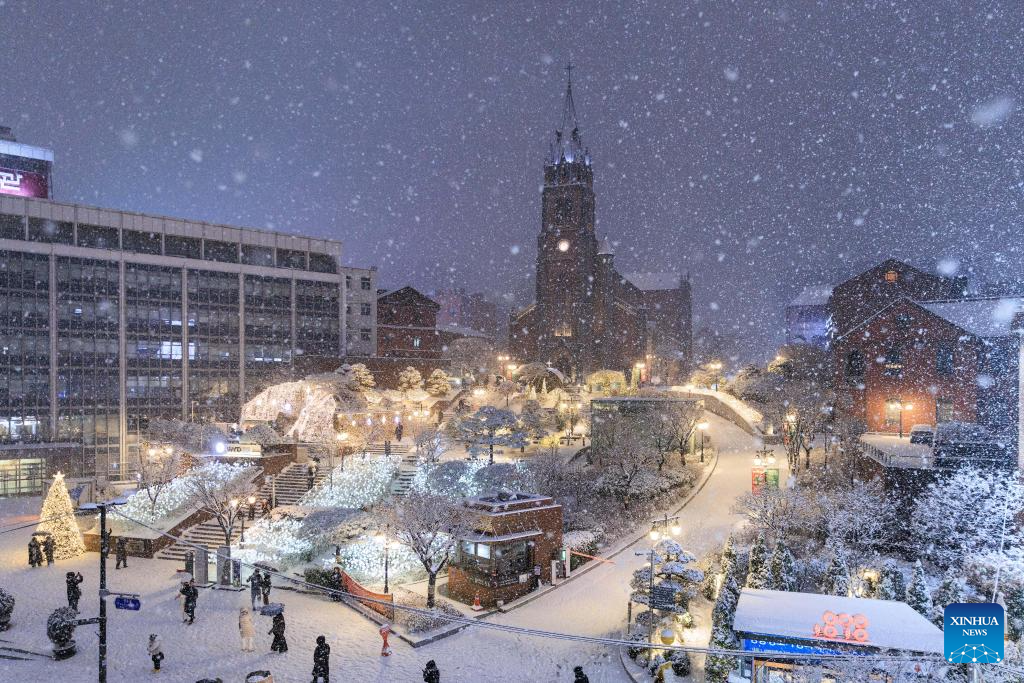 People walk in snow in Seoul, South Korea, on Dec. 4, 2025. Seoul on Thursday saw its first snowfall of this year. (Photo by Park Jintaek/Xinhua)