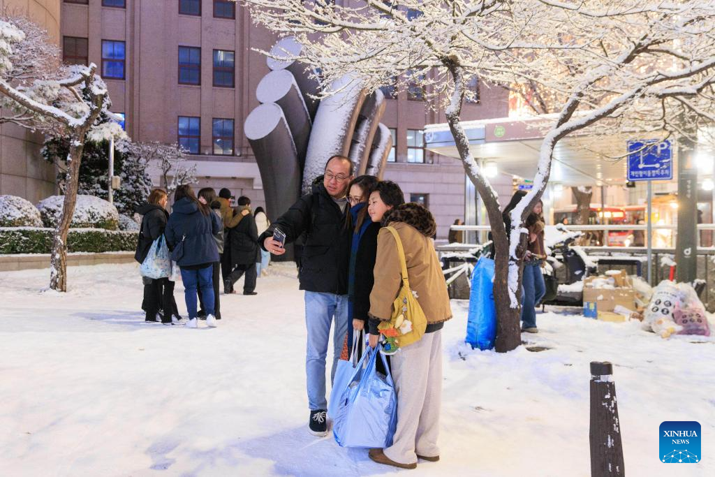 People take selfies in Seoul, South Korea, on Dec. 4, 2025. Seoul on Thursday saw its first snowfall of this year. (Photo by Park Jintaek/Xinhua)