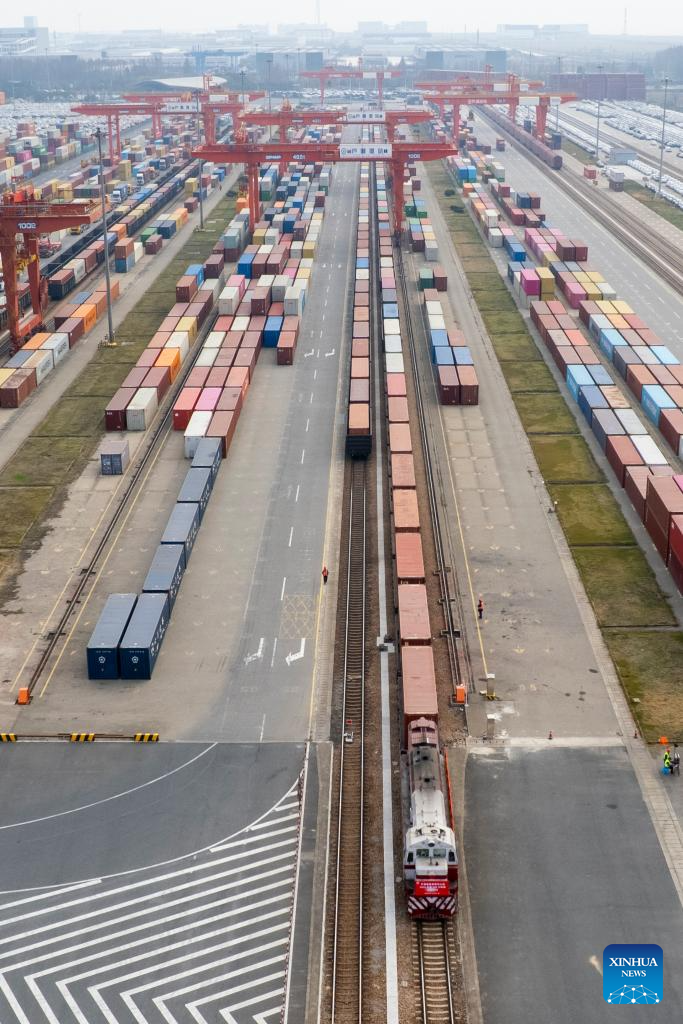 A sea-rail intermodal train departs from the Luchao Port container center station in east China's Shanghai, on Dec. 5, 2025. As of Dec. 5, Shanghai's sea-rail combined transport business volume has exceeded one million TEUs in 2025, registering a year-on-year increase of nearly 20 percent. (Xinhua/Wang Xiang)