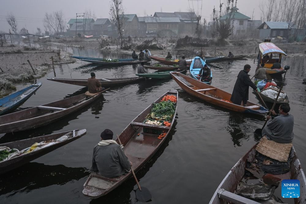 Vegetable vendors gather at a floating vegetable market in Srinagar, the summer capital of Indian-controlled Kashmir, Dec. 4, 2025. (Xinhua/Javed Dar)