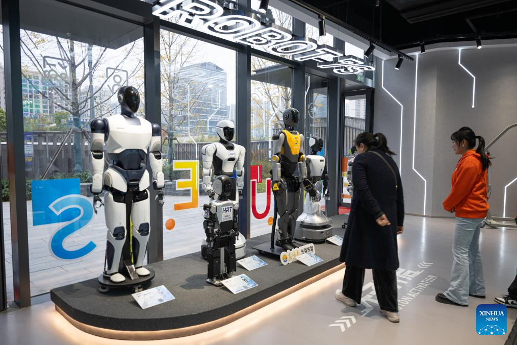 People visit a humanoid robots 7S shop in Wuhan East Lake High-tech Development Zone, also known as the optics valley of China, in Wuhan, central China's Hubei Province, Dec. 4, 2025. Relying on its scientific and educational resources as well as manufacturing advantages, Hubei is accelerating the layout of its humanoid robot industry chain this year.