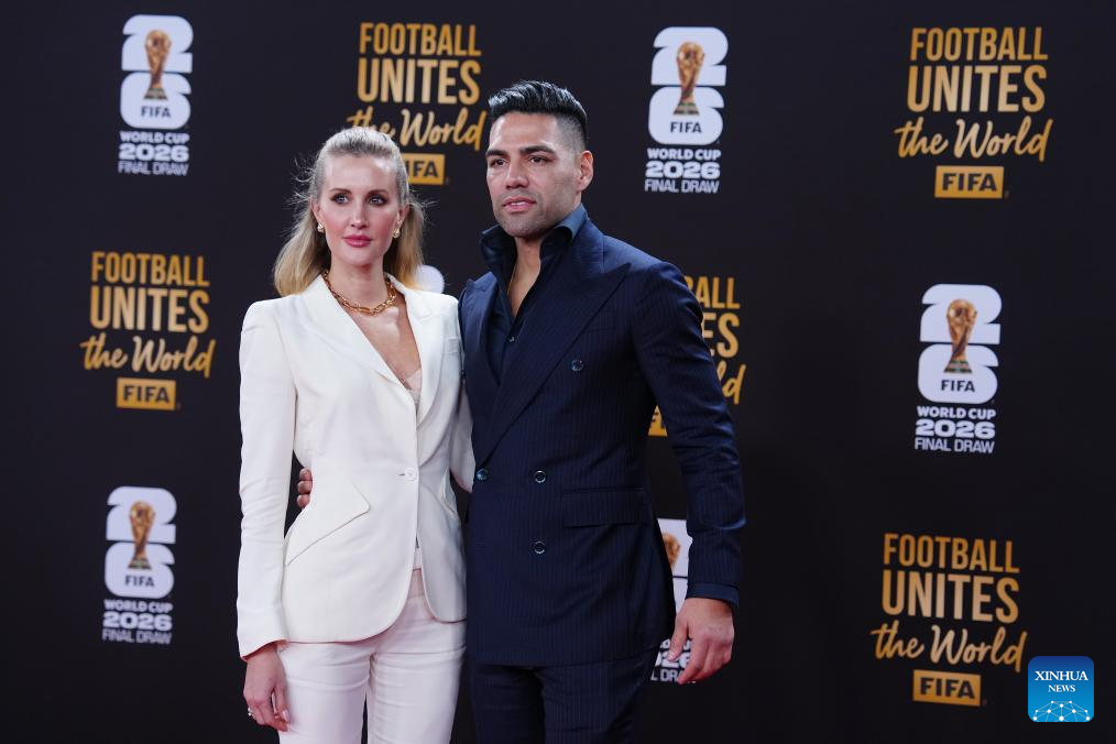 Colombian former football player Radamel Falcao (R) and his wife Lorelei Taron arrive for the welcome reception ahead of the final draw for the 2026 FIFA World Cup at John F. Kennedy Center for the Performing Arts in Washington, D.C., the United States, on Dec. 4, 2025. (Xinhua/Jia Haocheng)