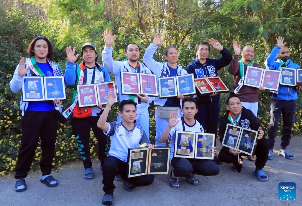 This video screenshot shows sailors of cargo vessel Eternity C posing for a group photo with gifts before boarding a plane at the Sanaa International Airport, in Sanaa, Yemen, on Dec. 3, 2025.