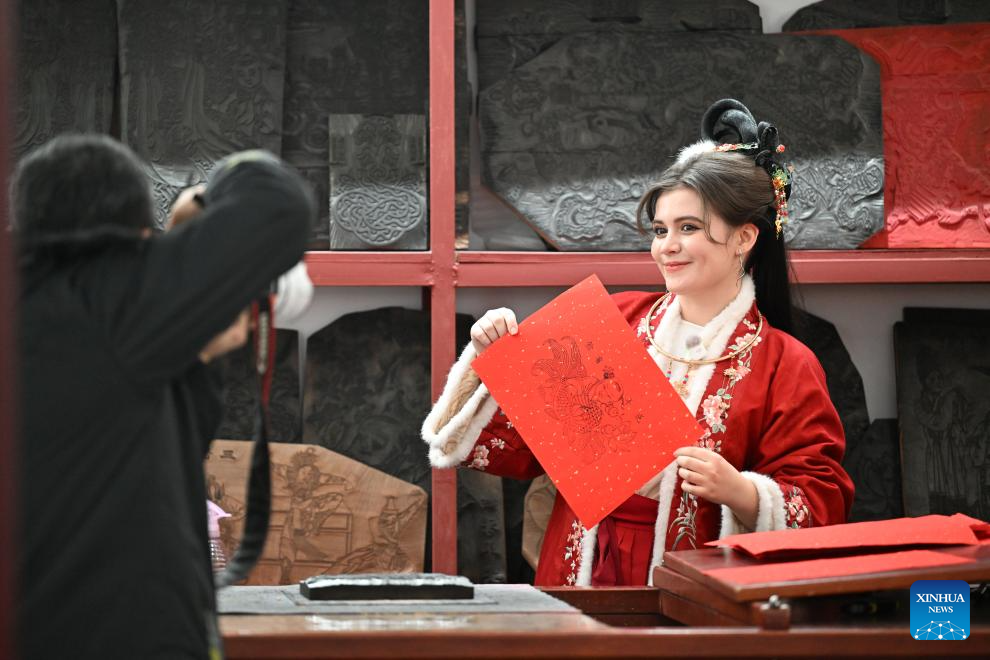A tourist takes photos after making a woodblock new year picture at Yangliuqing ancient town in Tianjin, north China, on Dec. 3, 2025.
