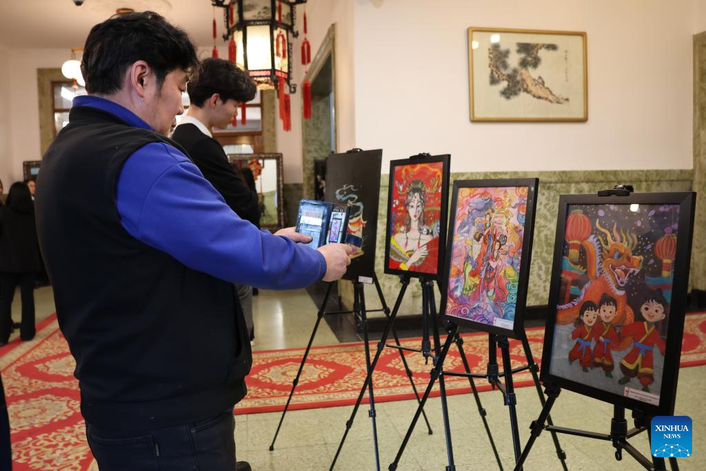 People view an art exhibition during an open day event held at the Chinese Embassy in Mongolia, in Ulan Bator, Mongolia, Dec. 5, 2025. The Embassy of China in Mongolia on Friday hosted an open day event, which was attended by more than 200 primary and secondary school teachers, students and parents in Ulan Bator.(Xinhua/Bolortsetseg)