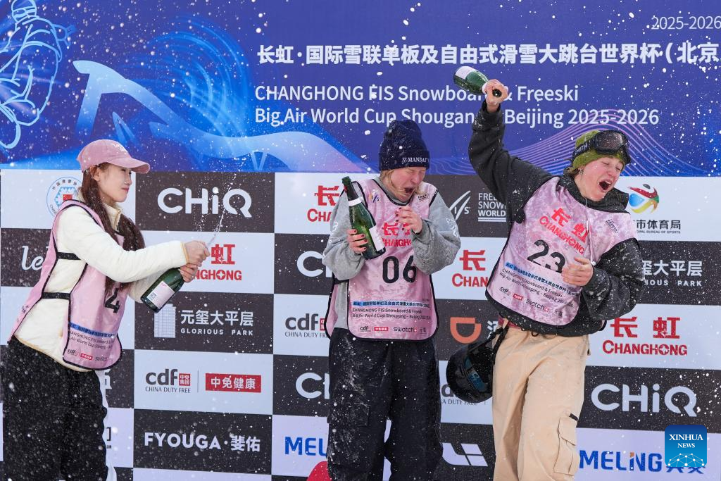 Gold medalist Anni Karava (C) of Finland, silver medalist Liu Mengting (L) of China and bronze medalist Naomi Urness of Canada celebrate during the awarding ceremony after the women's big air final at the FIS Freeski World Cup in Beijing, China, Dec. 6, 2025. (Xinhua/Ju Huanzong)