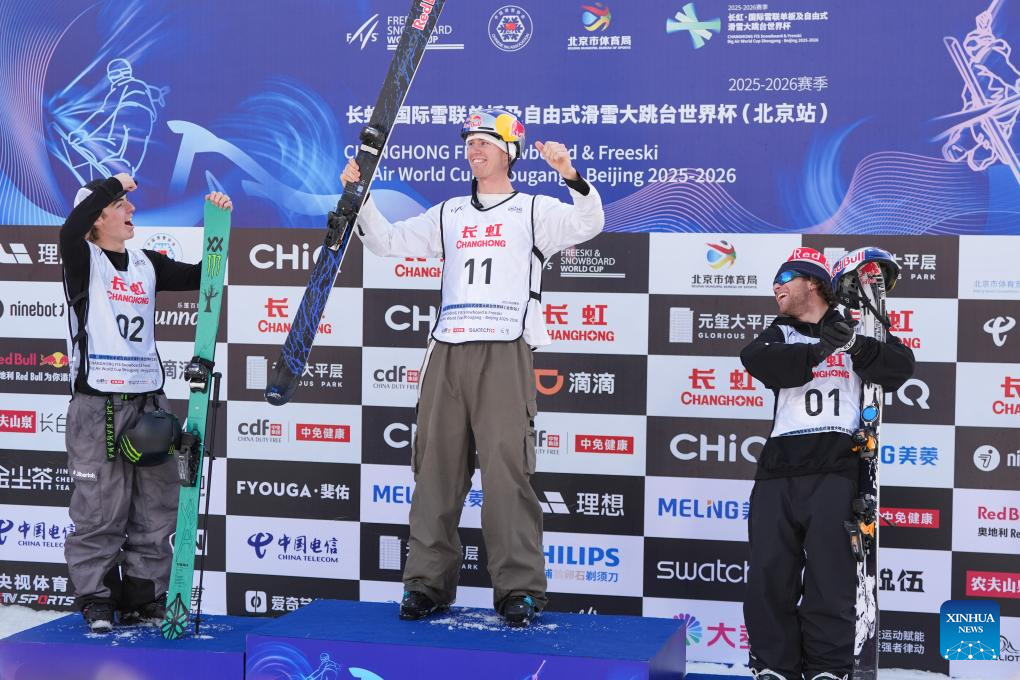 Gold medalist Ulrik Samnoey (C) of Norway, silver medalist Luca Harrington (L) of New Zealand and bronze medalist Matej Svancer of Austria celebrate during the awarding ceremony after the men's big air final at the FIS Freeski World Cup in Beijing, China, Dec. 6, 2025. (Xinhua/Ju Huanzong)