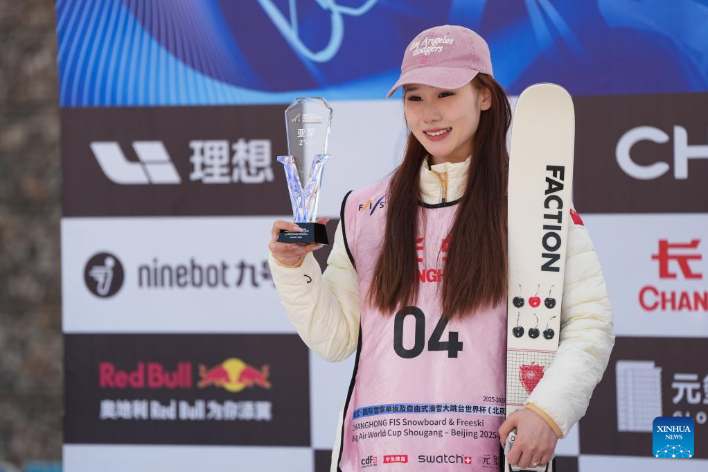 Silver medalist Liu Mengting of China poses during the awarding ceremony after the women's big air final at the FIS Freeski World Cup in Beijing, China, Dec. 6, 2025. (Xinhua/Ju Huanzong)