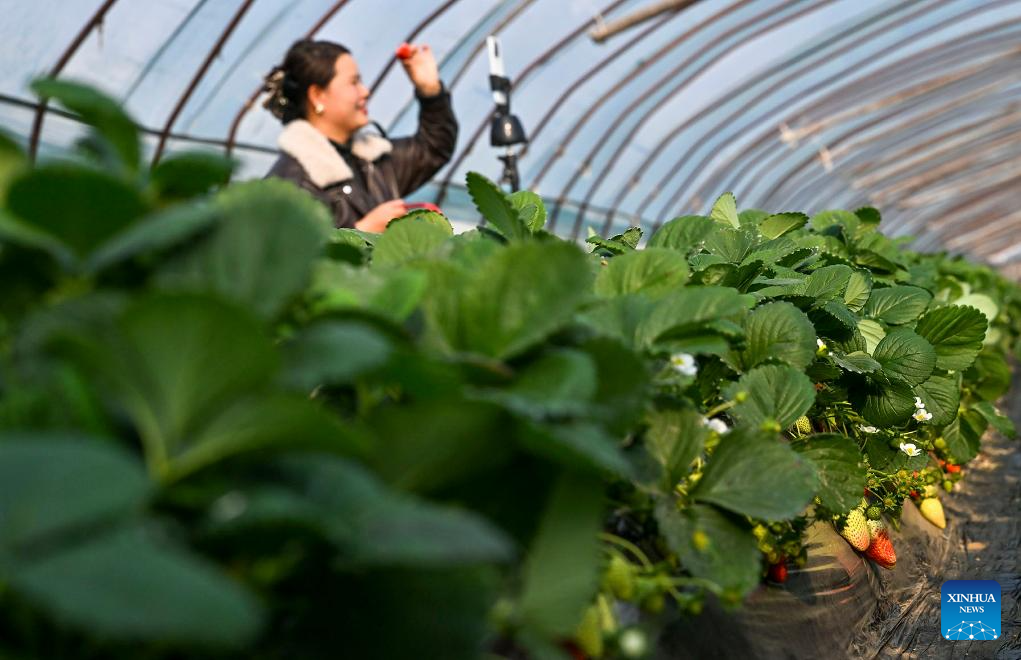 Staff members check the growth of strawberries in Weihai City, east China's Shandong Province, Dec. 6, 2025. As the solar term of Major Snow, also known as "Da Xue" in Chinese, is approaching, farmers are busy with agricultural production across the country. (Photo by Chen Hongqing/Xinhua)