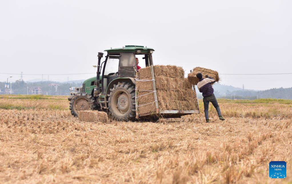 A man loads rice straw onto a tractor in Hezhou City, south China's Guangxi Zhuang Autonomous Region, Dec. 5, 2025. As the solar term of Major Snow, also known as "Da Xue" in Chinese, is approaching, farmers are busy with agricultural production across the country. (Photo by Liao Zuping/Xinhua)