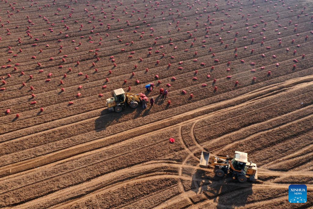 Farmers dig Chinese yam in Qinyang City, central China's Henan Province, Dec. 6, 2025. As the solar term of Major Snow, also known as "Da Xue" in Chinese, is approaching, farmers are busy with agricultural production across the country. (Photo by Yang Fan/Xinhua)