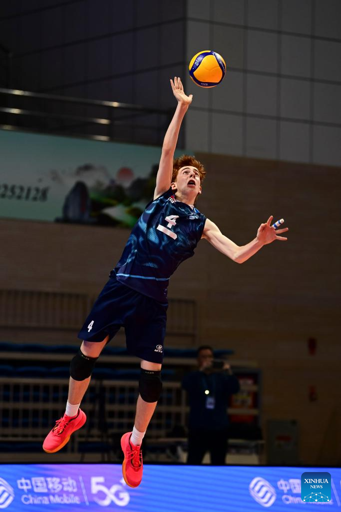 Manuel Valdivieso of Chile competes during the match against China's men's team 1 at the ISF U15 World School Volleyball Championship 2025 in Shangluo, northwest China's Shaanxi Province, Dec. 5, 2025. (Xinhua/Zou Jingyi)