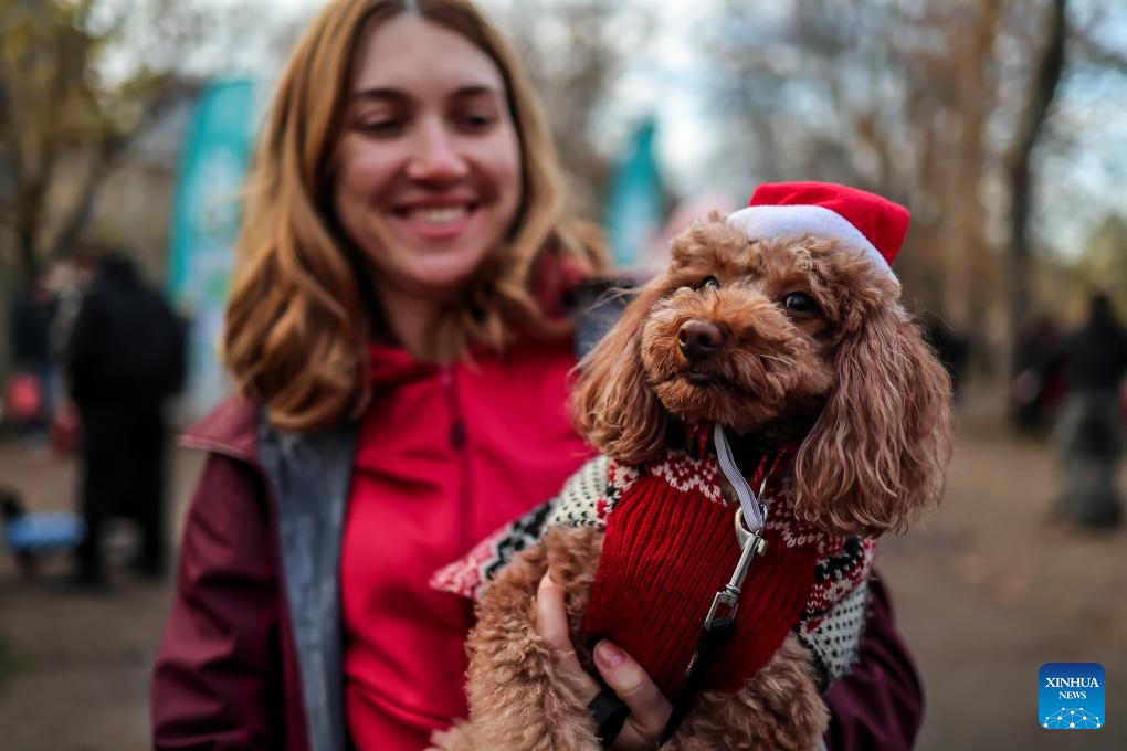 A dog and its owner participate in an annual "Santa Dog Walk" event at the City Park in Budapest, Hungary on Dec. 6, 2025. The Christmas-themed event brings together dog owners from across the city for a seasonal walk, promoting responsible pet ownership and encouraging outdoor activities for families and their pets. (Photo by David Balogh/Xinhua)