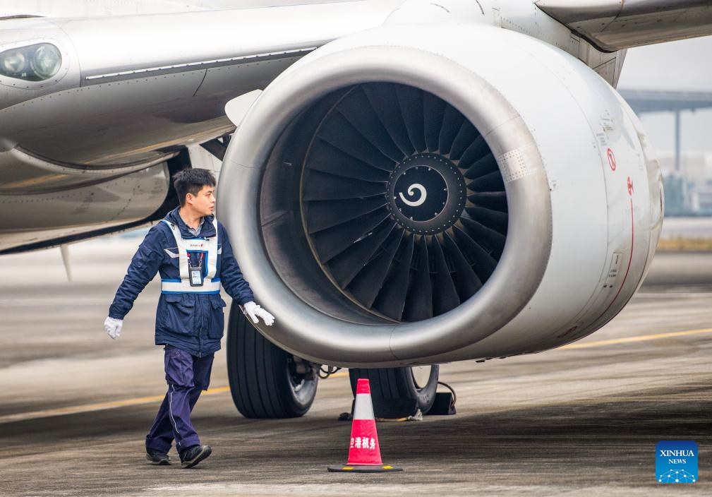 A staff member prepares for the inaugural flight of the Chongqing-Yangon cargo route at Chongqing Jiangbei International Airport in southwest China's Chongqing Municipality, Dec. 9, 2025.