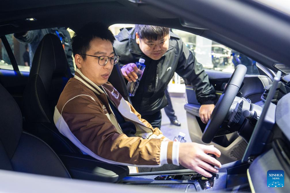 A visitor (1st R) learns about a car on display at the 21st Changsha International Automobile Expo in Changsha, central China's Hunan Province, on Dec. 10, 2025. The 6-day expo kicked off on Wednesday at the Changsha International Convention and Exhibition Center, showcasing some 1,000 vehicles from over 70 automobile brands. (Xinhua/Chen Sihan)