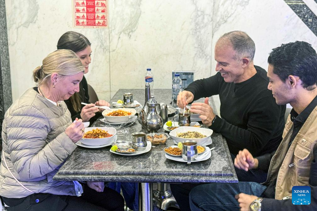 Customers eat Koshary at a restaurant in Cairo, Egypt, Dec. 10, 2025. Egypt's beloved national dish Koshary has been officially inscribed on the United Nations Educational, Scientific and Cultural Organization (UNESCO) Representative List of the Intangible Cultural Heritage of Humanity for 2025, the Egyptian Ministry of Culture said Wednesday in a statement. (Photo by Ahmed Gomaa/Xinhua)