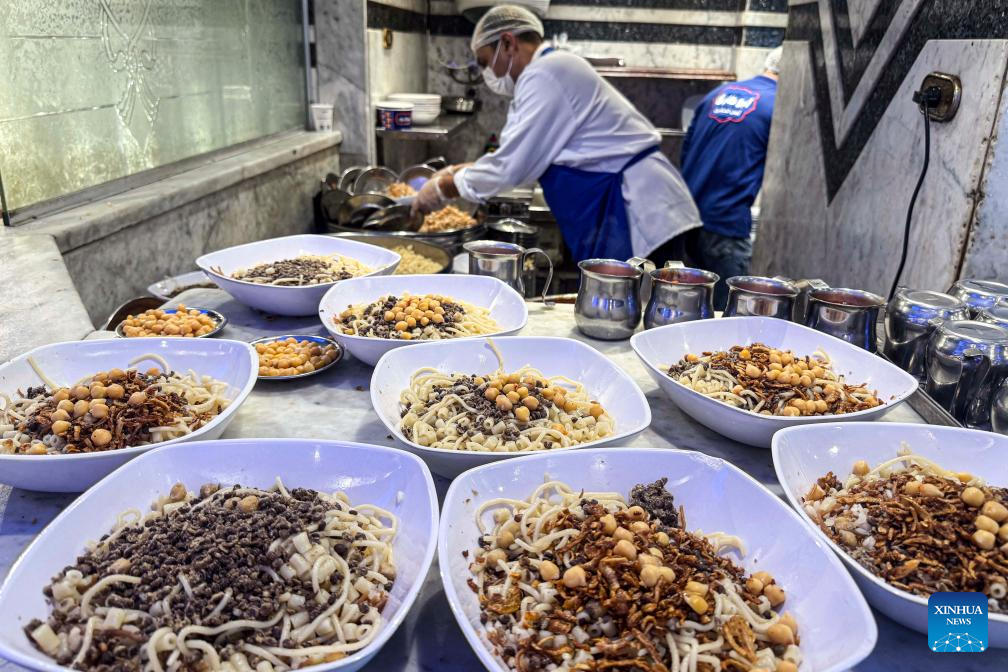 Photo taken on Dec. 10, 2025 shows Koshary at a restaurant in Cairo, Egypt. Egypt's beloved national dish Koshary has been officially inscribed on the United Nations Educational, Scientific and Cultural Organization (UNESCO) Representative List of the Intangible Cultural Heritage of Humanity for 2025, the Egyptian Ministry of Culture said Wednesday in a statement. (Photo by Ahmed Gomaa/Xinhua)