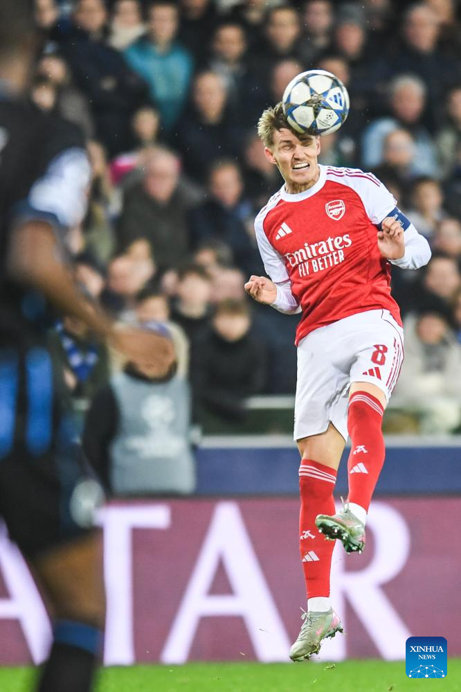 Martin Odegaard of Arsenal heads for the ball during the UEFA Champions League football match between Club Brugge and Arsenal in Bruges, Belgium, on Dec. 10, 2025. (Xinhua/Peng Ziyang)