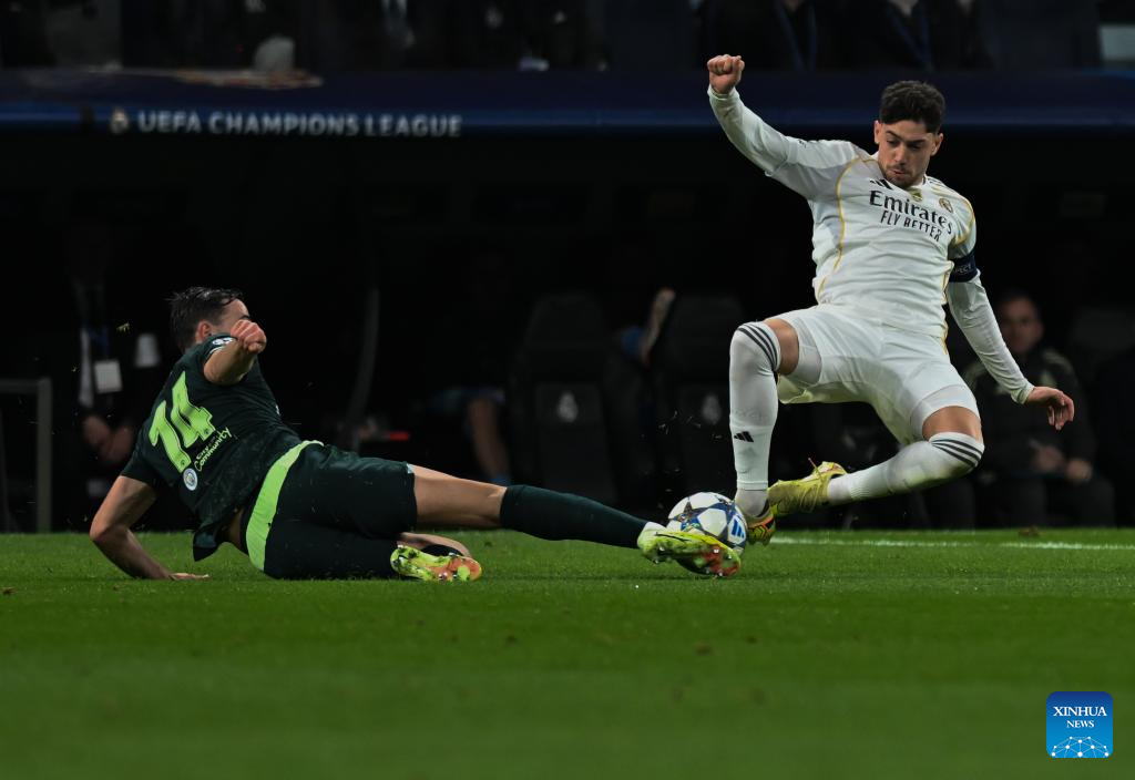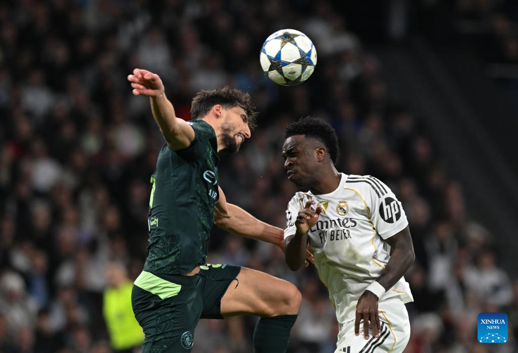 Josko Gvardiol (2nd R) of Manchester City heads for the ball during the UEFA Champions League football match between Real Madrid and Manchester City in Madrid, Spain, Dec. 10, 2025. (Xinhua/Cheng Min)