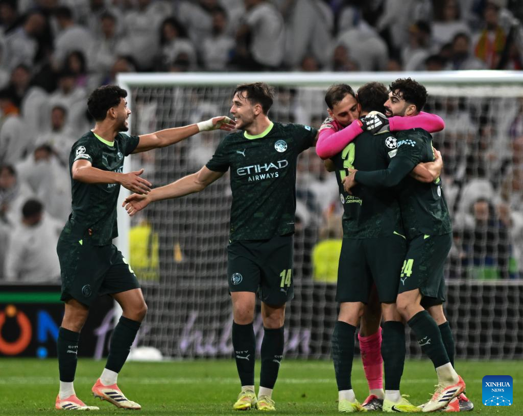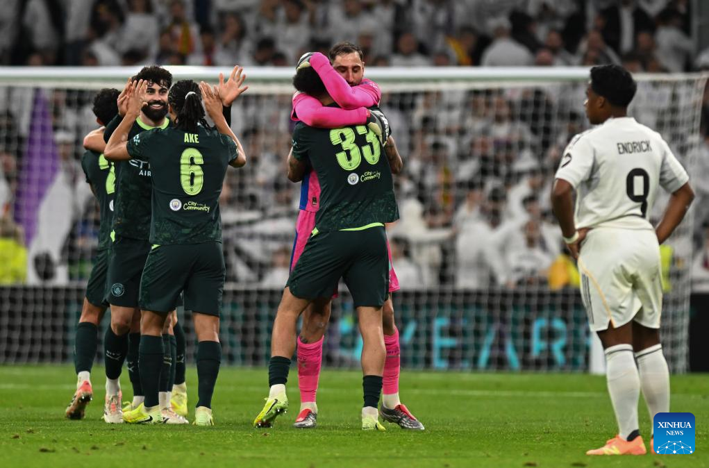 Players of Manchester City celebrate winning after the UEFA Champions League football match between Real Madrid and Manchester City in Madrid, Spain, Dec. 10, 2025. (Xinhua/Cheng Min)
