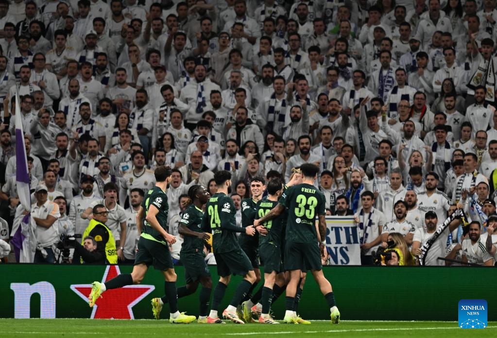 Players of Manchester City celebrate scoring during the UEFA Champions League football match between Real Madrid and Manchester City in Madrid, Spain, Dec. 10, 2025. (Xinhua/Cheng Min)