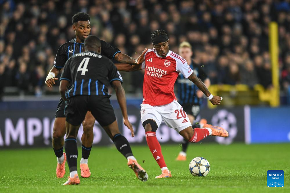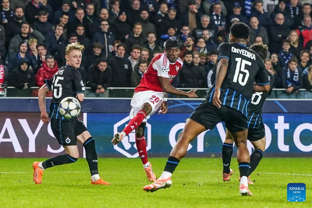 Noni Madueke (R) of Arsenal shoots during the UEFA Champions League football match between Club Brugge and Arsenal in Bruges, Belgium, on Dec. 10, 2025. (Xinhua/Peng Ziyang)