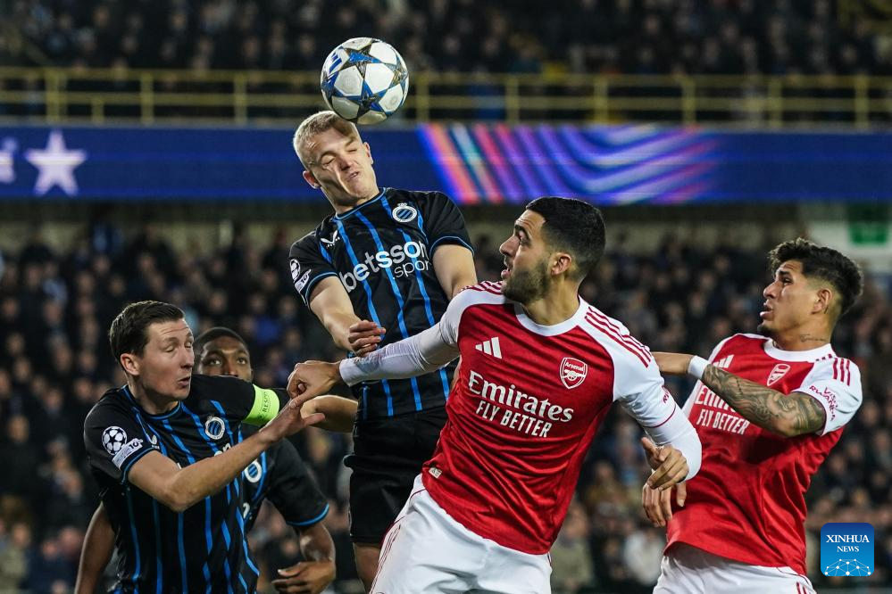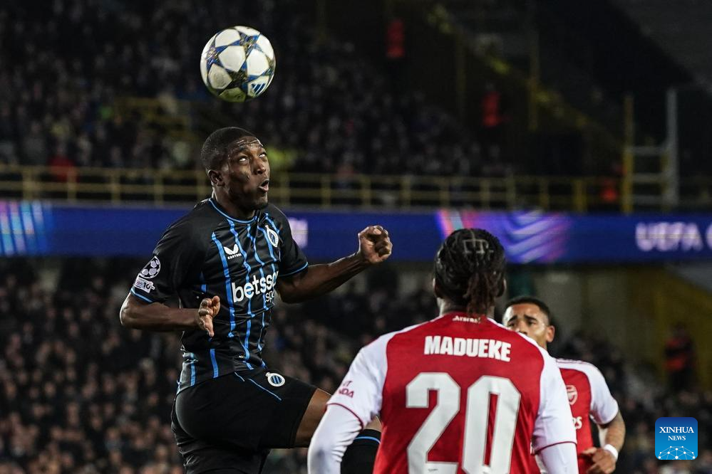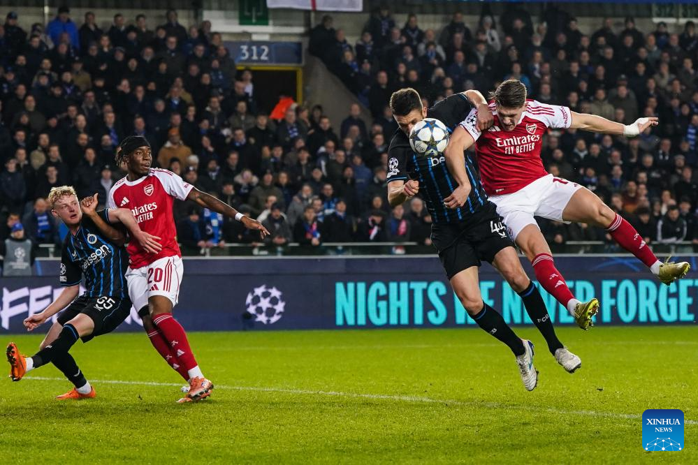 Hugo Siquet (3rd R) of Club Brugge heads for the ball during the UEFA Champions League football match between Club Brugge and Arsenal in Bruges, Belgium, on Dec. 10, 2025. (Xinhua/Peng Ziyang)