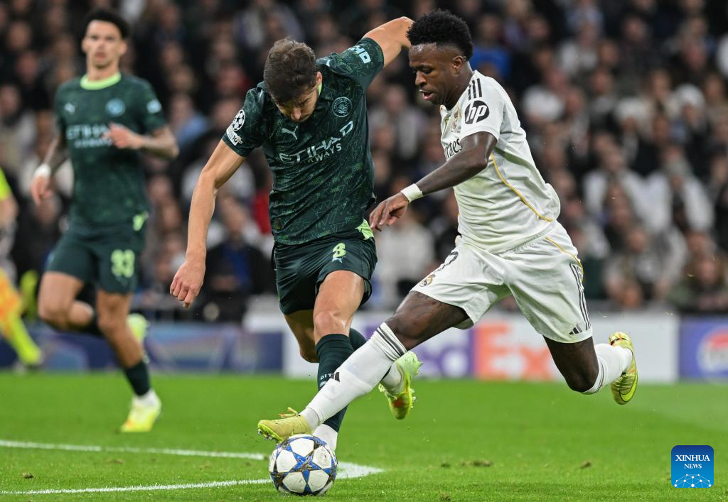 Vinicius Junior (R) of Real Madrid vies for the ball during the UEFA Champions League football match between Real Madrid and Manchester City in Madrid, Spain, Dec. 10, 2025. (Xinhua/Cheng Min)