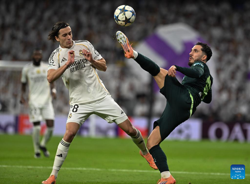 Dani Ceballos (L) of Real Madrid vies for the ball during the UEFA Champions League football match between Real Madrid and Manchester City in Madrid, Spain, Dec. 10, 2025. (Xinhua/Cheng Min)