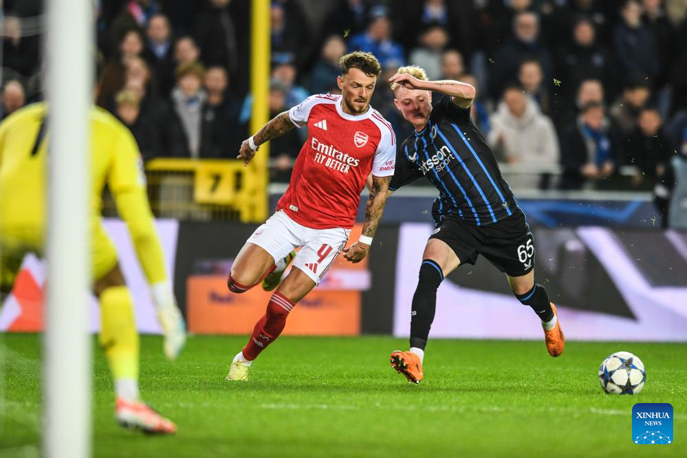 Ben White (L) of Arsenal and Joaquin Seys of Club Brugge vie for the ball during the UEFA Champions League football match between Club Brugge and Arsenal in Bruges, Belgium, on Dec. 10, 2025. (Xinhua/Peng Ziyang)
