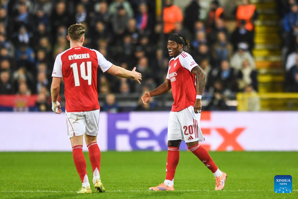 Noni Madueke (R) of Arsenal celebrates scoring with his teammate during the UEFA Champions League football match between Club Brugge and Arsenal in Bruges, Belgium, on Dec. 10, 2025. (Xinhua/Peng Ziyang)