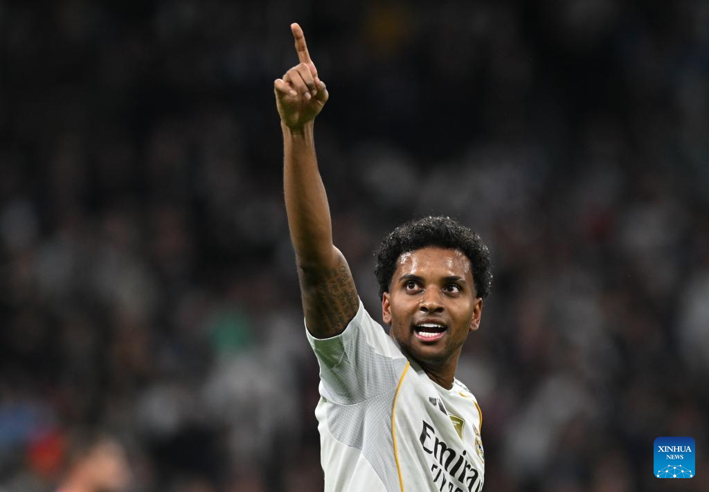 Rodrygo of Real Madrid celebrates scoring during the UEFA Champions League football match between Real Madrid and Manchester City in Madrid, Spain, Dec. 10, 2025. (Xinhua/Cheng Min)