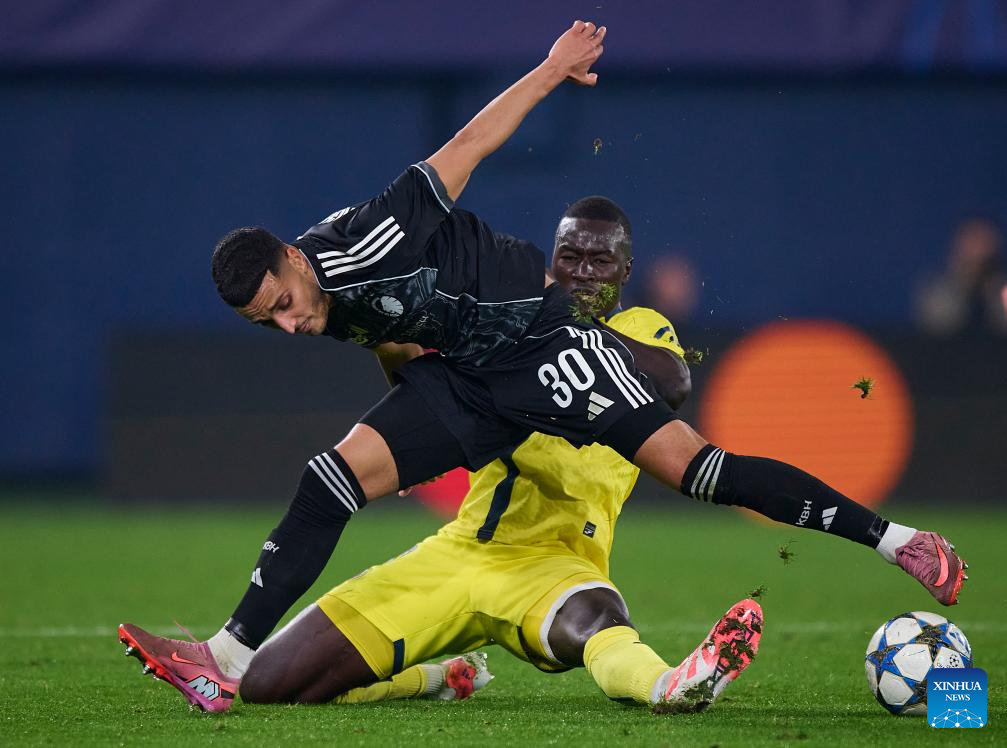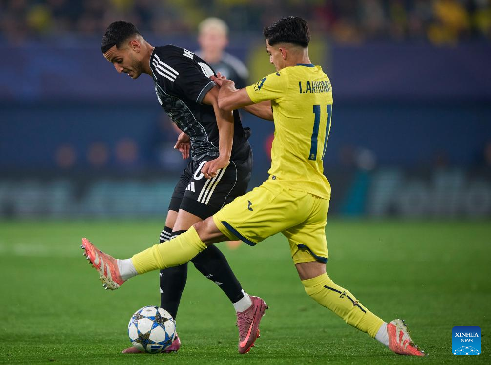 Elias Achouri (front) of Copenhagen and Pape Gueye of Villarreal vie for the ball during the UEFA Champions League football match between Villarreal and Copenhagen in Villarreal, Spain, on Dec. 10, 2025. (Str/Xinhua)
