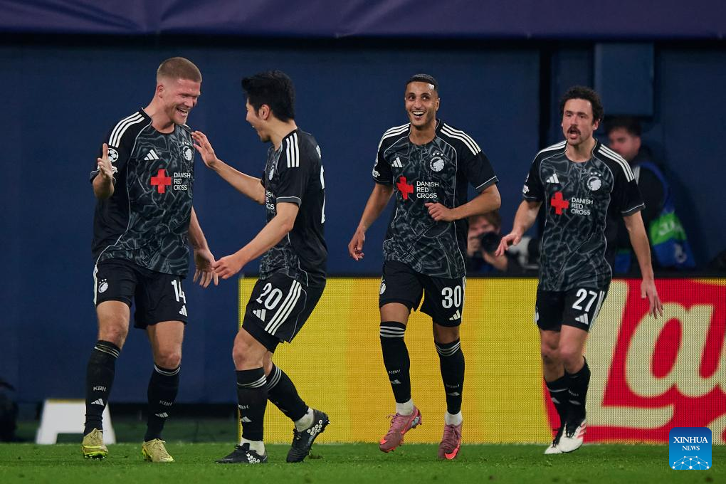 Players of Copenhagen celebrate scoring during the UEFA Champions League football match between Villarreal and Copenhagen in Villarreal, Spain, on Dec. 10, 2025. (Str/Xinhua)
