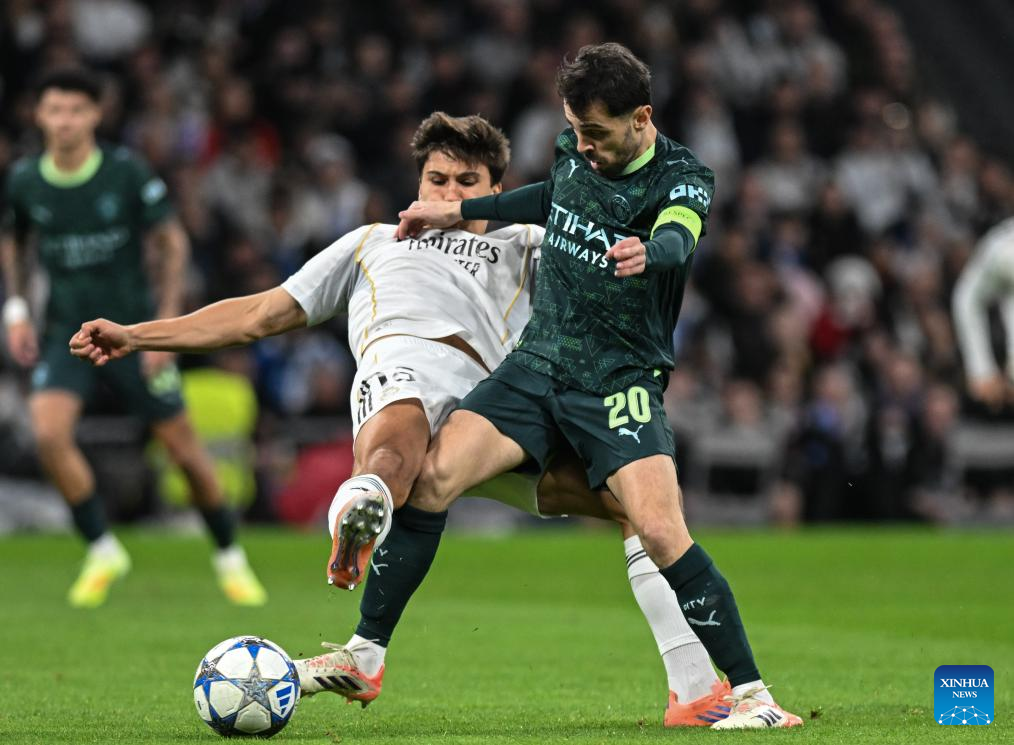Bernardo Silva (R) of Manchester City vies for the ball during the UEFA Champions League football match between Real Madrid and Manchester City in Madrid, Spain, Dec. 10, 2025. (Xinhua/Cheng Min)