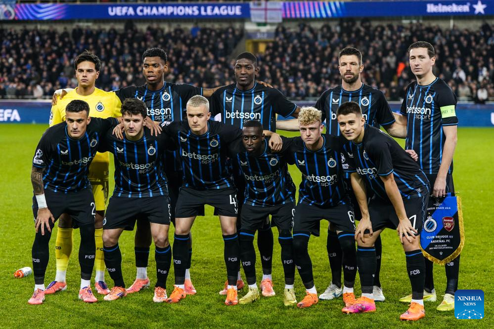 Players of Club Brugge pose for a group photo before the UEFA Champions League football match between Club Brugge and Arsenal in Bruges, Belgium, on Dec. 10, 2025. (Xinhua/Peng Ziyang)