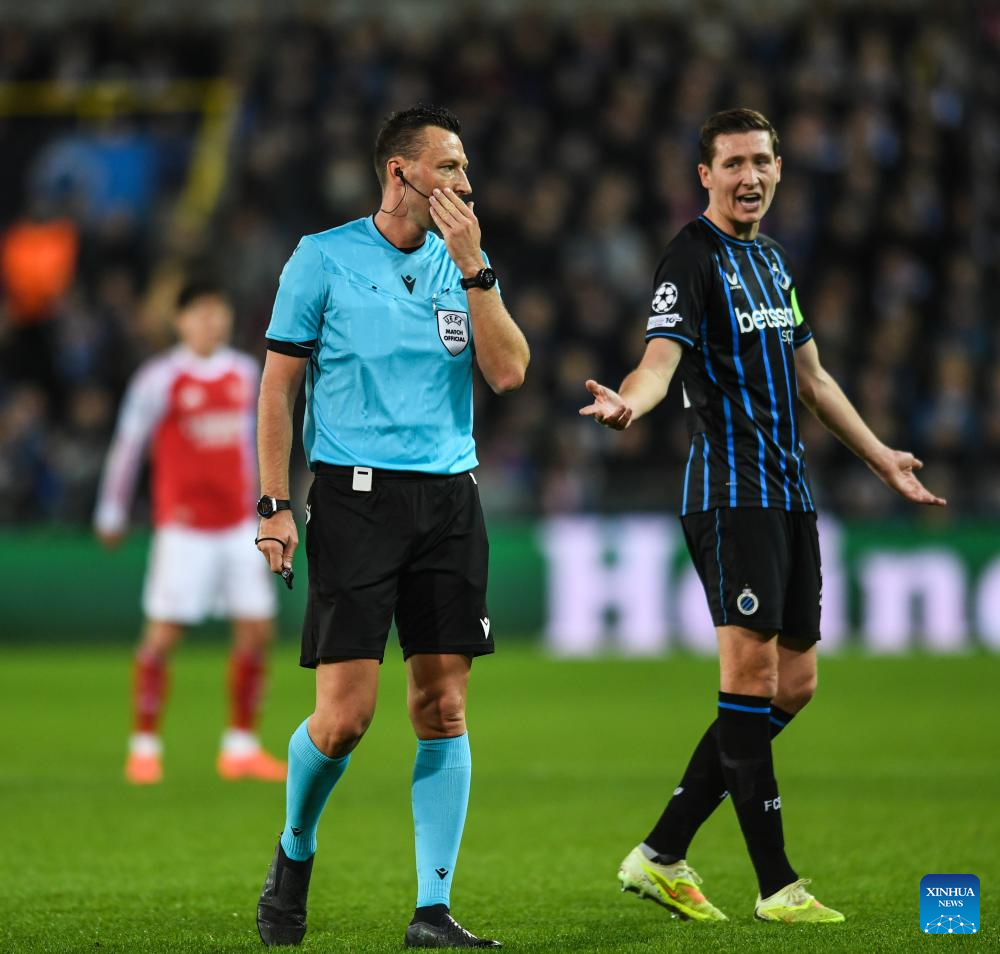 Hans Vanaken (R) of Club Brugge questions a call during the UEFA Champions League football match between Club Brugge and Arsenal in Bruges, Belgium, on Dec. 10, 2025. (Xinhua/Peng Ziyang)